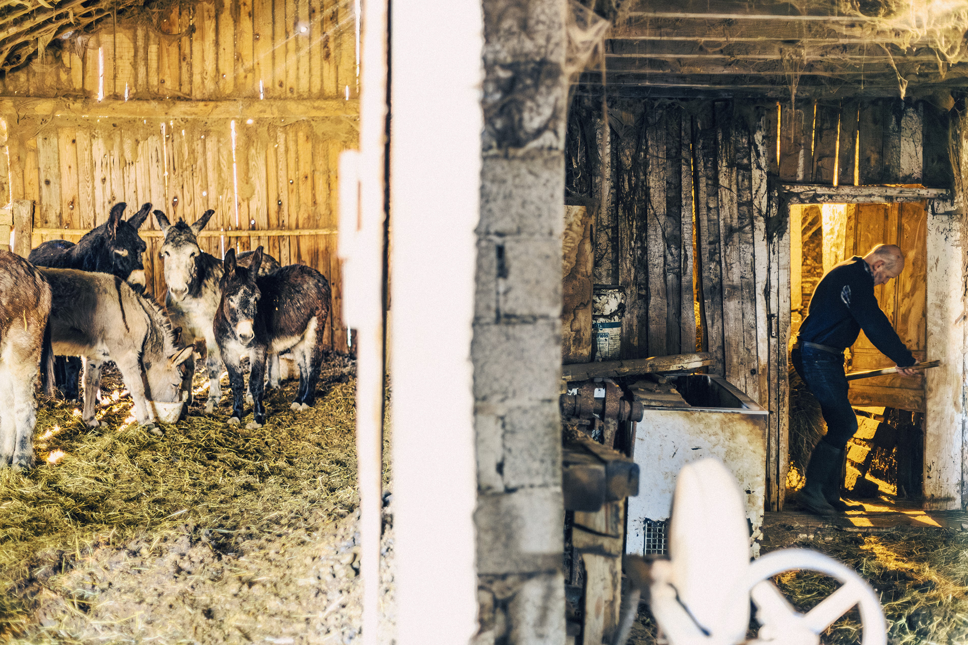 Alain Vallet remet du foin à ses ânes dans sa ferme à Levier dans le Doubs, France, mars 2026.